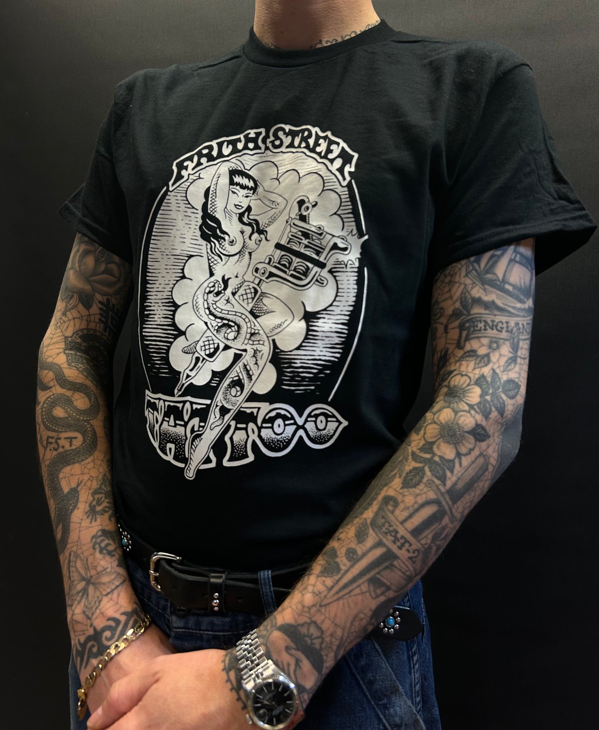Printed on a Gildan Heavy Black tee with a chest design in white.